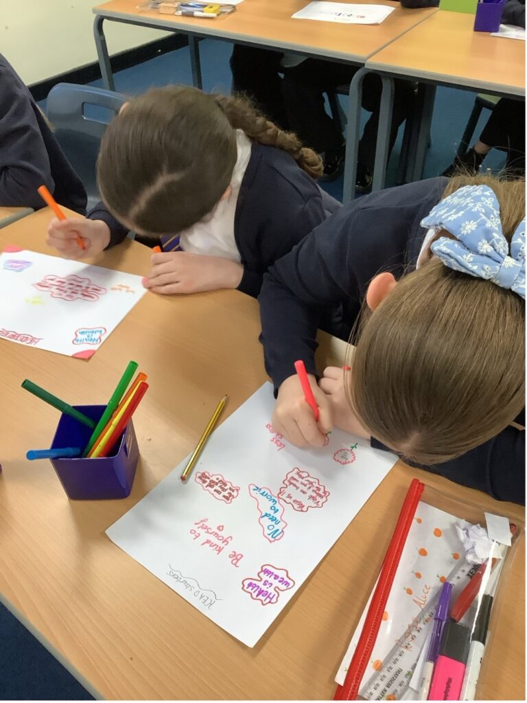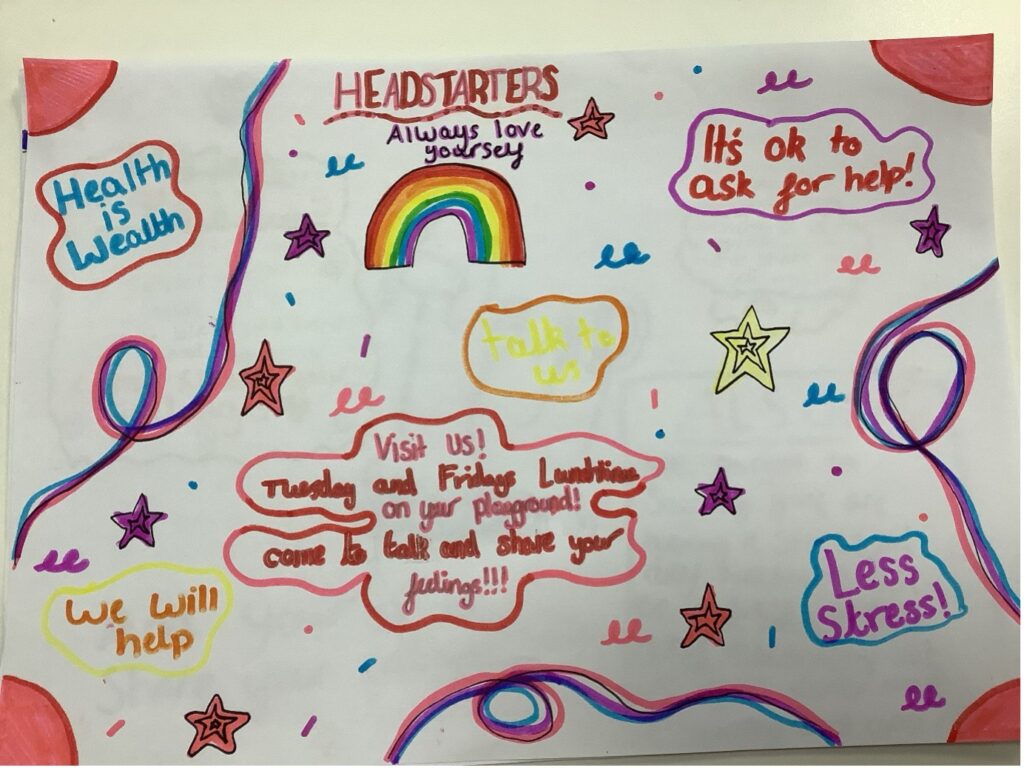 Children in KS2 are selected to complete Bronze, Silver and Gold HeadStart awards. This enables and equips them with tools to work with children across all year groups. The work that the HeadStarter children complete has a focus on Mental Health and Wellbeing.