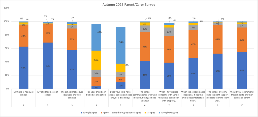 | 10 | I would recommend this school to another parent or carer. | 54% | 37% | 5% | 2% | 1% |